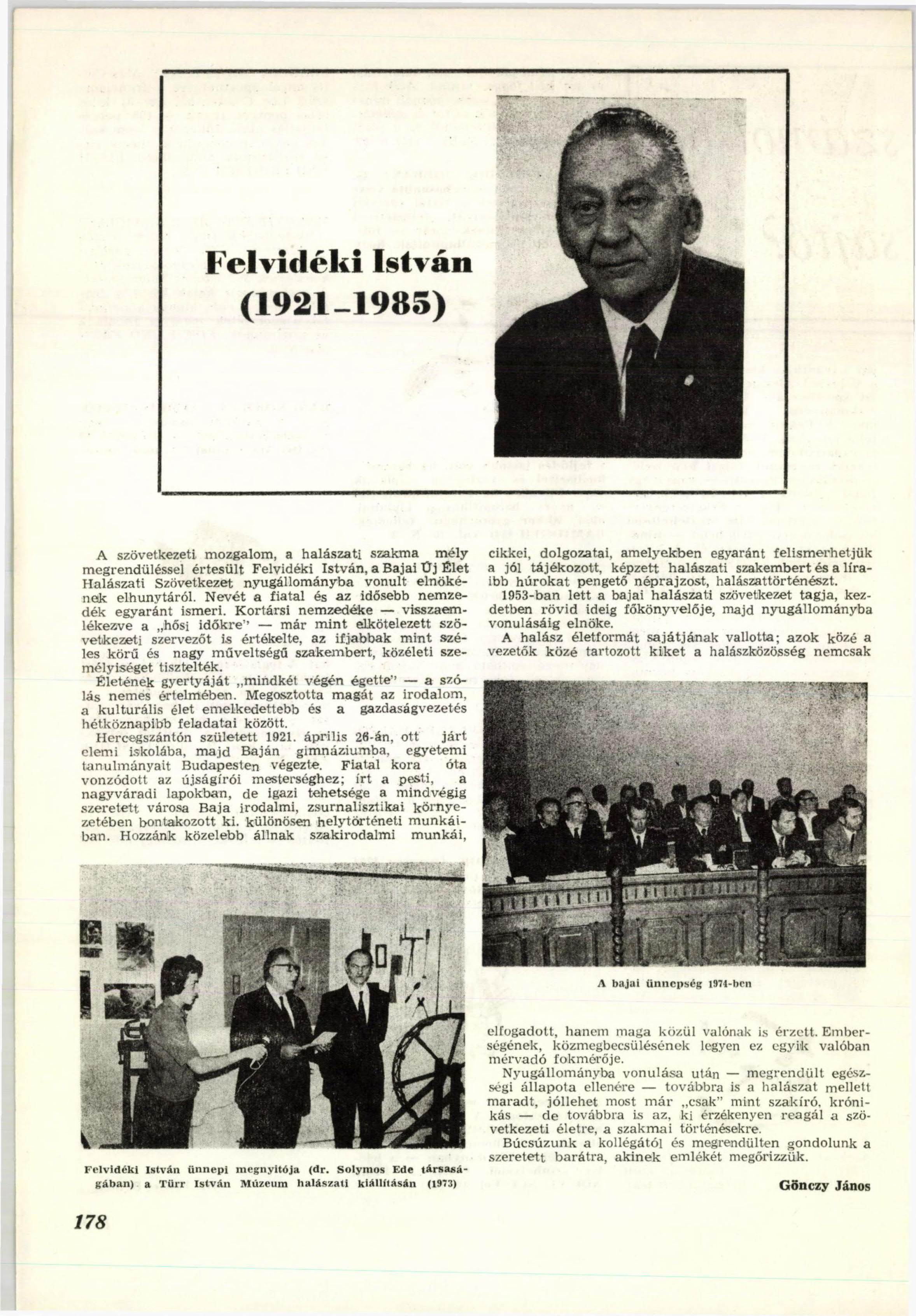 A szövetkezeti mozgalom, a halászati szakma mély megrendüléssel értesült Felvidéki István, a Bajai Új Élet Halászati Szövetkezet nyugállományba vonult elnökének elhunytáról. Nevét a fiatal és az idősebb nemzedék egyaránt ismeri. Kortársi nemzedéke — visszaemlékezve a „hősi időkre” — már mint elkötelezett szövetkezeti szervezőt is értékelte, az ifjabbak mint széles körű és nagy műveltségű szakembert, közéleti személyiséget tisztelték.