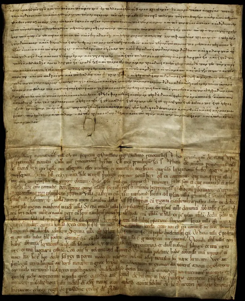 Oklevelünk ismertté válása is ezzel kezdetét vette. Péterfy Károly 1741-ben tette közzé az oklevél görög szövegének egy kis részletét latin fordításban.18 Ebben a király rendelkezéseinek megszegőire átkot mond, s ezzel párhuzamba állította Szent István törvényének azt a szakaszát, amelyben Isten házának megsértőire kiközösítés büntetését helyezik kilátásba. Csaknem a teljes szöveget közölte továbbra is csak latin fordításban Szegedy János 1750-ben,19 illetve Batthyány Ignác 1785-ben.20 Az első, aki a görög szöveget közzétette 1770-ben, Pray György volt.21 A jezsuita rend eltörlése (1773) után oklevelünk a Kamarai Levéltárba került, s azzal együtt ma a Magyar Országos Levéltár Mohács előtti gyűjteményében található mindkét példányban, mint e levéltár legrégebbi eredeti oklevele.22 Ezt megelőzően 1895-től mintegy fél évszázadon át a Magyar Nemzeti Múzeum Levéltára adott otthont az egyik példánynak.23