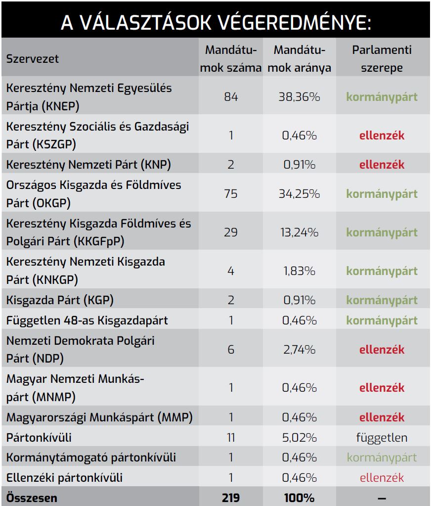 A választásokat egy új – a régi politikai elittel szemben a szociáldemokraták híján egyetlen alternatívának látszó – politikai tábor nyerte meg: a kisgazdák. Nyilván az új választói rétegeknek köszönhetően. Az egy nagy és négy kisebb kisgazdapárt összesen 111 mandátumot szerzett a 219 tagú Nemzetgyűlésben, és bizonyosan elérte volna az abszolút többséget is, ha az országos erőszak nem áll a KNEP mögé.