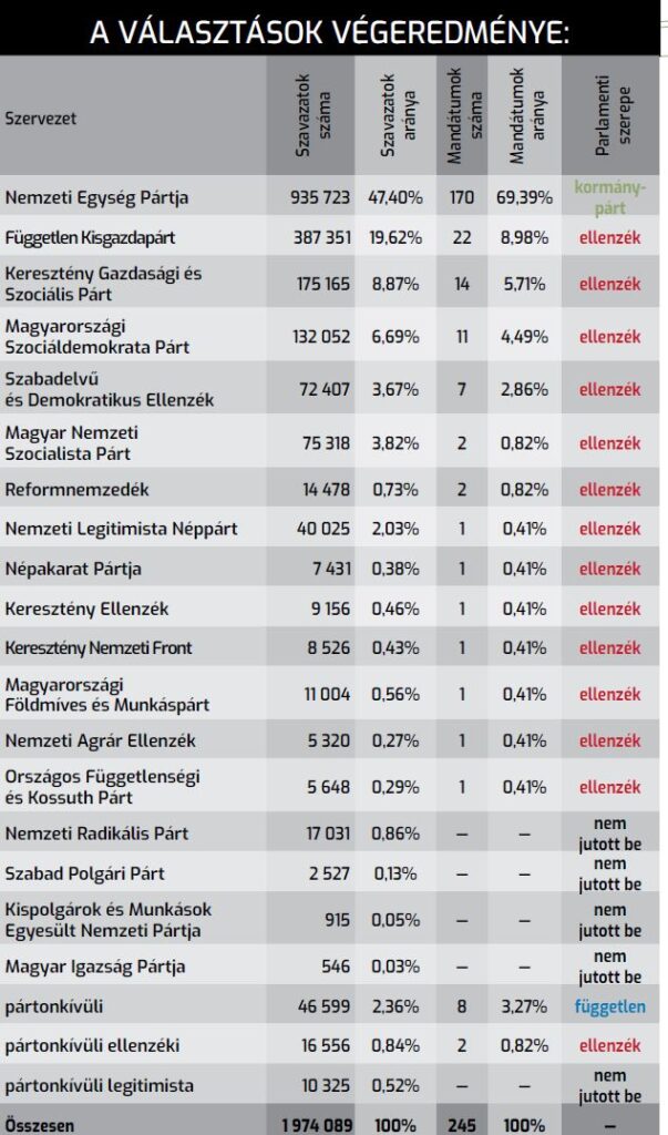 Ez már tényleg az utolsó volt a nyílt választások sorában. A következő választáson, éppen a második zsidótörvény elfogadása után, már titkosan választhat az ország népe, és ennek, miként sorozatunk következő részében látni fogjuk, a nyilasok lesznek a haszonélvezői. Legnagyobb vesztesei pedig a szociáldemokraták, akik legrégebben, legszenvedélyesebben és legkövetkezetesebben harcoltak az általános és titkos választójogért.